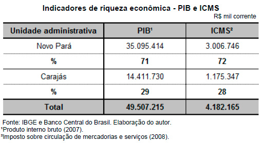 “A concluir pelo que revelam dois dos principais indicadores de riqueza: o ICMS, maior fonte de recursos próprios dos estados, e o PIB, principal indicador de riqueza econômica regional, vê-se que alguns mitos que ganharam força entre lideranças políticas e empresariais paraenses são refutados pelo que expressam os números a saber: i) o mito difundido no sul-sudeste paraense (Carajás) de que esta região é a principal fonte de receita fiscal do governo estadual; ii) o mito que graça na região metropolitana de Belém de que a sub-região Carajás representa a parte mais rica do Estado do Pará. As evidências estatísticas demonstram que essas concepções não se sustentam, posto que após a emancipação de Carajás o Estado do Pará ainda ficará com 71% do PIB e 72% do ICMS. Diga-se de passagem, a Grande Belém tem riqueza equivalente à da sub-região que ora propõe autonomia. Mas se essas evidências não forem suficientes para demonstrar que o governo paraense não será abalado em suas finanças, considere, ainda que este terá sua área e população diminuídas e, consequentemente, serão reduzidos seus gastos com o custeio da máquina administrativa e das funções públicas que visam atender a população da área desmembrada.”